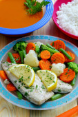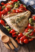 Danie do pieczenia smacznych ryb okonia morskiego z warzywami na stole, zbliżenie