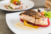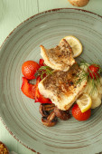 Drewniana deska smacznych ryb okonia morskiego z warzywami na stole
