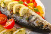 Drewniana deska smacznych ryb okonia morskiego z warzywami na stole