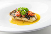 Płyta smacznych ryb okonia morskiego z czerwonym kawiorem na jasnym tle