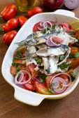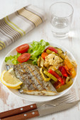 Płyta smacznych ryb okonia morskiego z warzywami na stole, zbliżenie