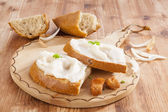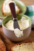 Miska rozłożone smalec i kawałki chleba na czarnym tle