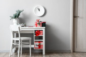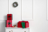 Klatka piersiowa szuflady z pudełkami na prezenty świąteczne w pobliżu ściany światła