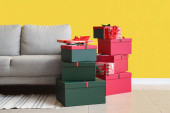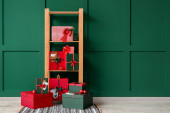 Klatka piersiowa szuflady z pudełkami na prezenty świąteczne w pobliżu ściany światła