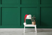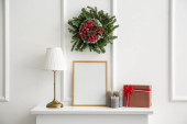 Krzesło i drabina z pudełkami świątecznymi w pobliżu ściany światła