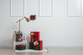 Drabinka z lampą i pudełkami prezentów świątecznych w pobliżu ściany światła