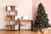 Stolik z książkami, łabędziem i lampą przy ścianie