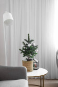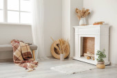 Krzesło z kubkami i wieniec jemioły wiszące na jasnej ścianie