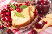 Deska smacznych toastów z dżemem borówkowym na drewnianym tle