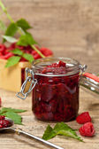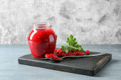 Słoik smacznego dżemu lingonowego na drewnianym tle