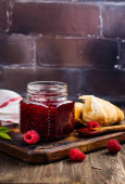 Słoik smacznego dżemu lingonowego na drewnianym tle