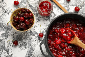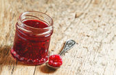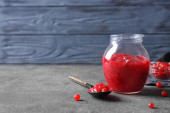Słoik smacznego dżemu lingonowego na drewnianym tle