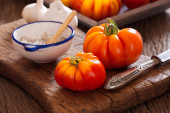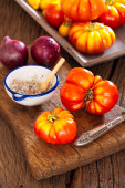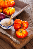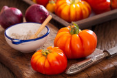 Zdjęcie "Wołowiny pomidorów, sól miseczka z łyżeczką i nóż" może być wykorzystywane do celów osobistych i komercyjnych zgodnie z warunkami zakupionej licencji Royalty-free. Obraz jest dostępny do pobrania w jakości wysokiej rozdzielczości do 5760x3840.