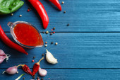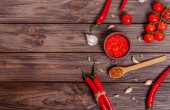 Chili z różnymi przyprawami na drewnianym piętrze widok z góry z miejsca do kopiowania