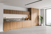 Zdjęcie "Stylowa drewniana kuchnia z białą górną częścią szafki, jasnoszary marmurowy backsplash, panoramiczne okno i betonowa podłoga. Pojęcie nowoczesnego wystroju wnętrz. Widok na róg. 3d renderowanie" może być wykorzystywane do celów osobistych i komercyjnych zgodnie z warunkami zakupionej licencji Royalty-free. Obraz jest dostępny do pobrania w jakości wysokiej rozdzielczości do 5760x3840.