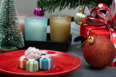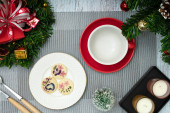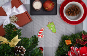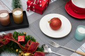 Boże Narodzenie stół nakrycie z surgar herbatniki na jasnoczerwonym ceramicznym talerzu.