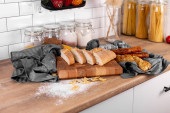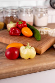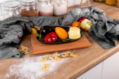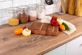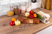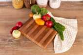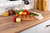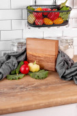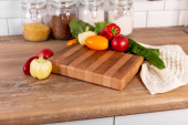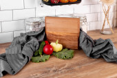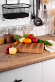 Skład kuchni, designerska deska drewniana, warzywa, ręcznik kuchenny we wnętrzu