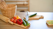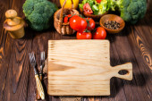 Skład kuchni, designerska deska drewniana, warzywa, ręcznik kuchenny we wnętrzu