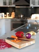 Skład kuchni, designerska deska drewniana, warzywa, ręcznik kuchenny we wnętrzu