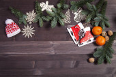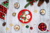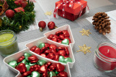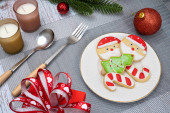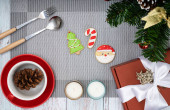 Świąteczne dekoracje stołowe z filiżanką kawy, herbatniki pokryte cukrem, świeca zapachowa i czerwone pudełko prezentów.