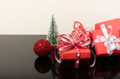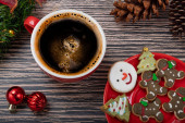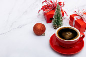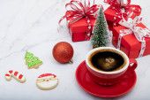 Świąteczne dekoracje stołowe z filiżanką kawy, herbatniki pokryte cukrem, świece zapachowe i czerwone pudełka upominkowe.
