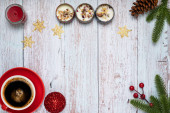 Zdjęcie "Świąteczne dekoracje stołowe z filiżanką kawy, herbatniki pokryte cukrem, świece zapachowe i czerwone pudełka upominkowe." może być wykorzystywane do celów osobistych i komercyjnych zgodnie z warunkami zakupionej licencji Royalty-free. Obraz jest dostępny do pobrania w jakości wysokiej rozdzielczości do 5760x3840.
