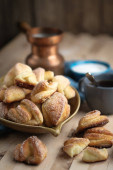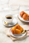 Ciasto nadziewane - rugelach lub kipferl. Wykonane z masła i serem śmietankowym ciasta z orzechowym kremem czekoladowym. Obraz pionowy.