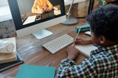 Młody blackman z gitara nauczania muzyki na ekranie laptopa