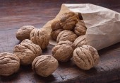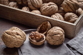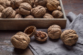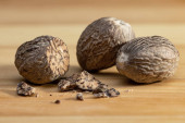 Kupa gałek muszkatołowych na drewnianym brązowym tle. Przyprawy i przyprawy. Zbliżenie, zdjęcie studyjne.