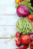 Letnia rama ze świeżymi organicznymi warzywami i owocami na drewnianym tle