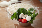 Pieczone pomidory i cukinia z bazylią w naczyniu do pieczenia z sosem jogurtowym z przyprawami i oliwą z oliwek w tle na drewnianej desce do krojenia. Jedzenie w domu