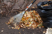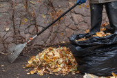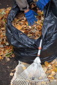 Jesienna praca w ogrodzie. Ręce w niebieskich rękawiczkach umieścić spadające liście w dużej plastikowej torbie