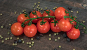Małe czerwone pomidory wiśniowe na drewnianym tle deski