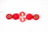 Zdjęcie "Małe czerwone pomidory wiśniowe na drewnianym tle deski. Połóż się w rzędzie" może być wykorzystywane do celów osobistych i komercyjnych zgodnie z warunkami zakupionej licencji Royalty-free. Obraz jest dostępny do pobrania w jakości wysokiej rozdzielczości do 5760x3840.