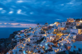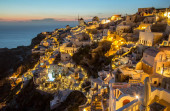 Panoramiczny widok na Oia, miasto turystyczne na wyspie Santorini, Grecja