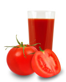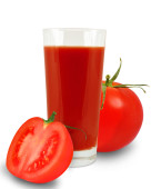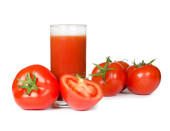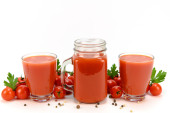 Widok z boku szklanki soku pomidorowego i kupy pomidorów. Izolacja na białym tle.