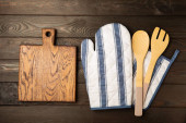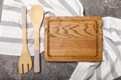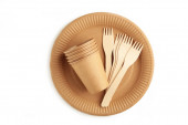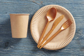 Ekologiczne jednorazowe papierowe zastawy stołowe. Kubek papierowy, torba papierowa, widelce drewniane, talerz papierowy na ciemnym tle drewna. Recykling lub zielona koncepcja.