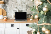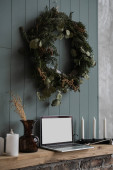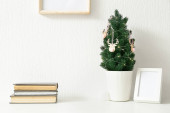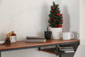 Wazon z gałązek jodłowych i świąteczne kulki na biurku w pokoju