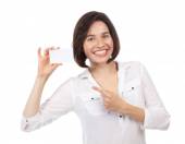 kobieta trzyma się firmy lub karty kredytowej na białym tle
