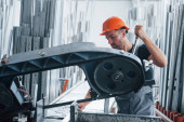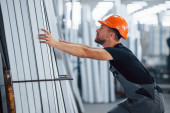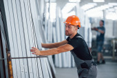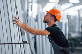 Zdjęcie "W magazynie z wieloma przedmiotami. Pracownik przemysłowy w fabryce. Młody technik w pomarańczowym twardym kapeluszu." może być wykorzystywane do celów osobistych i komercyjnych zgodnie z warunkami zakupionej licencji Royalty-free. Obraz jest dostępny do pobrania w jakości wysokiej rozdzielczości do 5760x3840.