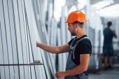 Używanie maszyny do programowania operacji. Pracownik przemysłowy w fabryce. Młody technik w pomarańczowym twardym kapeluszu.