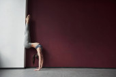 Procedura treningowa. Dziewczyna z dobrym typem ciała fitness mają ćwiczenia w pokoju spacey.