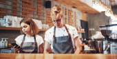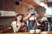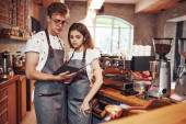 Pracujemy razem. Dwóch młodych pracowników kawiarni w domu. Pojęcie działalności gospodarczej i usług.