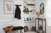 Zdjęcie "Stylowe wnętrze pokoju z komodą, wiklinowym fotelem i doniczkową rośliną eukaliptusową w pobliżu drewnianej ściany" może być wykorzystywane do celów osobistych i komercyjnych zgodnie z warunkami zakupionej licencji Royalty-free. Obraz jest dostępny do pobrania w jakości wysokiej rozdzielczości do 5760x3840.