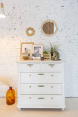 Stylowe wnętrze pokoju z komodą, wiklinowym fotelem i doniczkową rośliną eukaliptusową w pobliżu drewnianej ściany