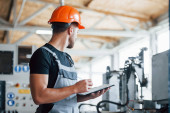 Zdjęcie "Nowoczesny laptop. Wpisuję na klawiaturze. Pracownik przemysłowy w fabryce. Młody technik w pomarańczowym twardym kapeluszu." może być wykorzystywane do celów osobistych i komercyjnych zgodnie z warunkami zakupionej licencji Royalty-free. Obraz jest dostępny do pobrania w jakości wysokiej rozdzielczości do 5760x3840.