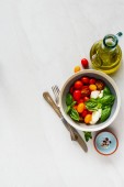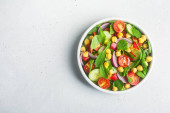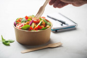 Wegetariańska sałatka z fasoli ciecierzycy przygotowana z pomidorów, ogórka, czerwonej cebuli, sałatki z rzeżuchy i rukoli w papierowej misce. Zero odpadów naczynia, drewniany widelec