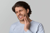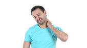 Zdenerwowany młody biały mężczyzna cierpiący na podrażnienie i drapanie skóry na szyi, z bolesnym wyrazem twarzy