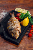 side view jedzenie tło stek ribeye wołowiny na kamiennym talerzu z sosem i chlebem i masłem na drewnianym stole do menu restauracji