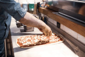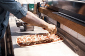Zbliżenie męskich dłoni trzymających tacę z przygotowanym khachapuri
